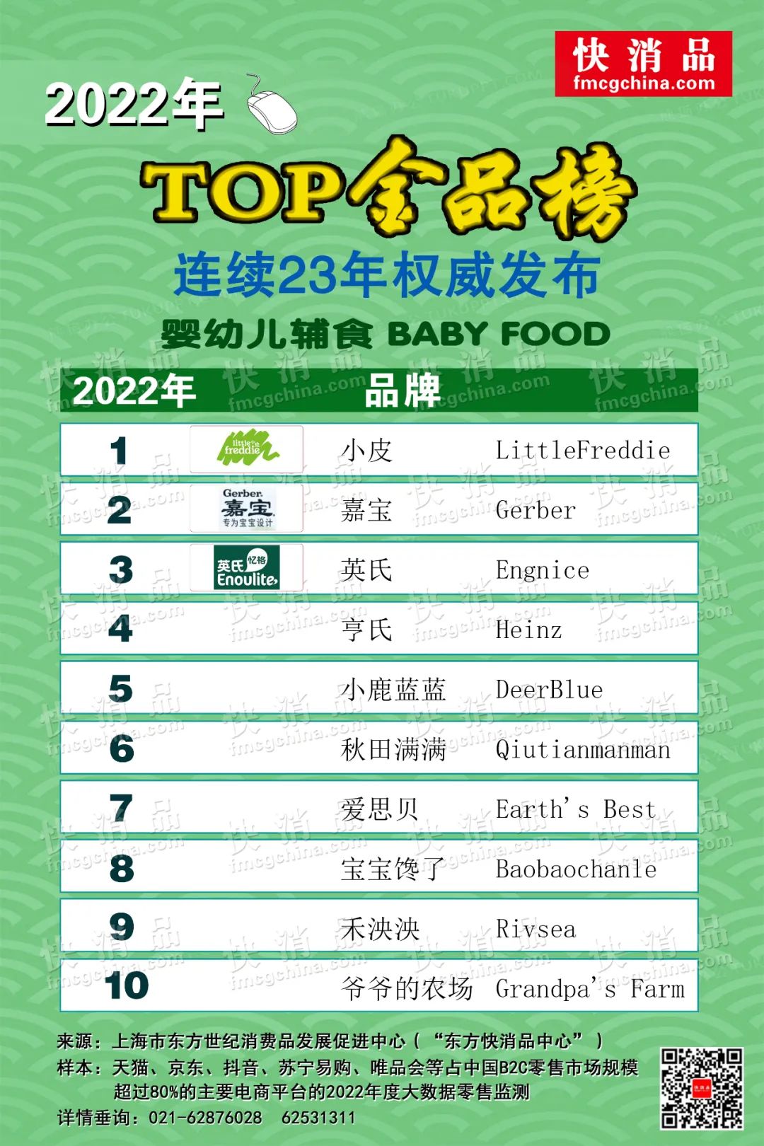 2022婴幼儿辅食线上“TOP金品榜”由Buck家族创建的小皮摘得桂冠,其最近发表的《6-36月龄婴幼儿四维科学喂养方案》也获得了国内同领域专家认可。排名第二的雀巢旗下品牌嘉宝,一直致力于为成长初期的婴幼儿提供营养健康的食品。第三、第四名分别为英氏和亨氏。前者联合中国妇幼保健协会等相关专家共同推出了标志性的“5阶精准喂养体系”;后者常常举行婴幼儿营养学的科普活动,以提高妈妈们对其的关注度。第五、第六名为小鹿蓝蓝与秋田满满,秋田满满近期成为DSM首个中国婴幼儿辅食战略合作伙伴,双方将共同提升行业原料品质。此外,爱思贝、宝宝馋了、禾泱泱、爷爷的农场也在本次“TOP金品榜”上,其中宝宝馋了与江南大学成立联合实验室,并和浙江农科院合作,曾获得天猫双十一婴幼儿辅食TOP10。方广、碧欧奇则遗憾落榜。
