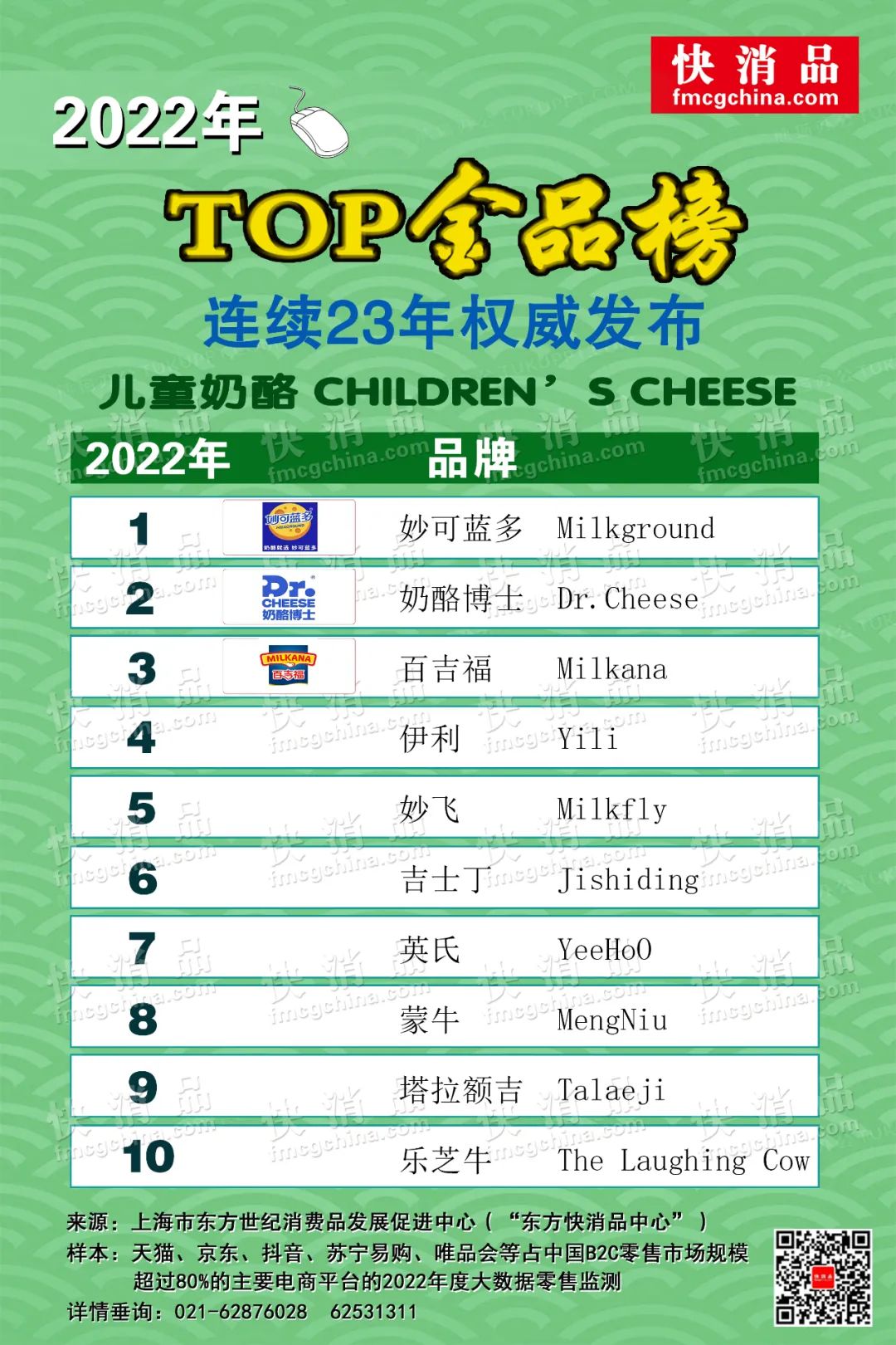 此次,《快消品》发布“2022线上TOP金品榜——儿童奶酪、婴幼儿辅食”,其中妙可蓝多、小皮夺得品类冠军,奶酪博士、百吉福、嘉宝、英氏等品牌登榜。