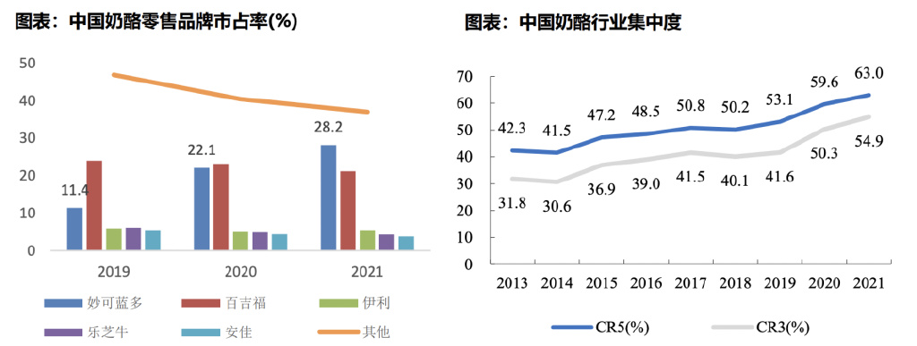然而,国内的奶酪市场却并没有因为品牌增加、新晋玩家变多出现“去中心化”现象,反而出现集中度不断增加的趋势,我们的主角妙可蓝多市占率更是呈现惊人的增长势态,而前文提到的什么妙飞、奶酪博士、蒙牛,在奶酪这个市场可以说毫无存在感(这或许是蒙牛要收购妙可蓝多并把自己的奶酪业务注入的原因之一吧)……
