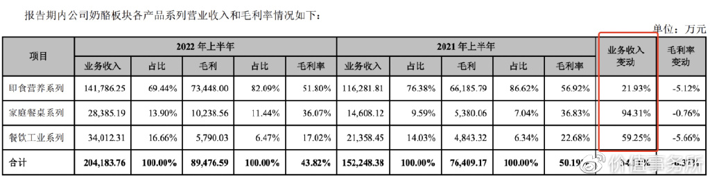 下图来自公司2022半年度报告,家庭餐桌系列(里面的煎烤奶酪、马苏里拉是所长近期无限复购的东西)、餐饮工业系列(就是卖给奶茶店、餐饮店等一切需要用到奶酪的企业,属于to B业务)收入分别同比增长94.31%、59.25%,远远超过以奶酪棒为代表的即食营养21.93%的增速。