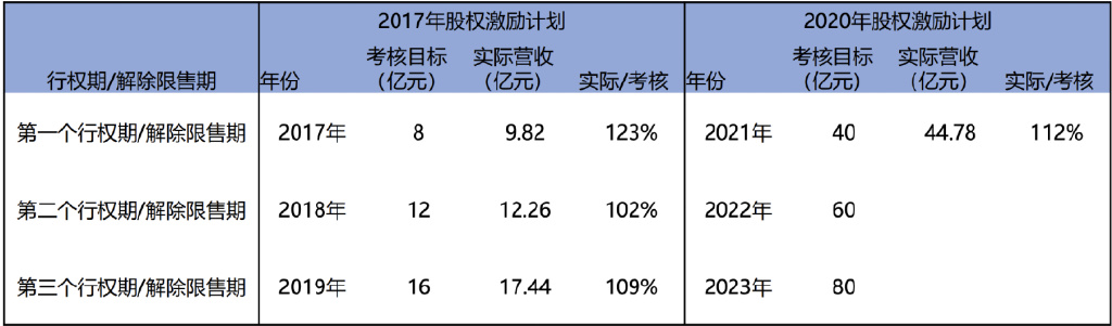 别的不说,我们先来看一下妙可蓝多的股权激励方案,2017年营收考核目标8亿,实际实现9.82亿,2021年营收考核目标就变成40亿,实际实现44.78亿。