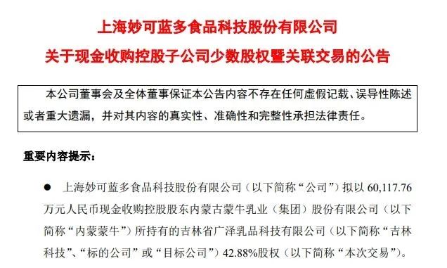 日前,上海妙可蓝多食品科技股份有限公司(以下简称“妙可蓝多”)拟以60,117.76万元人民币现金收购控股股东内蒙古蒙牛乳业(集团)股份有限公司(以下简称“内蒙蒙牛”)所持有的吉林省广泽乳品科技有限公司(以下简称“吉林科技”)42.88%股权。