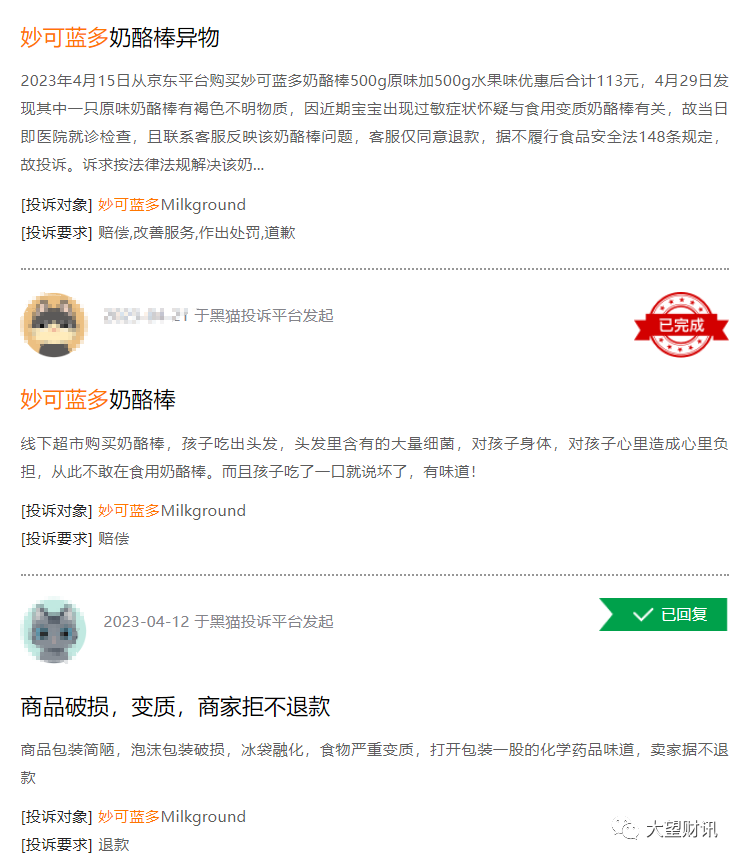 除了虚假宣传问题,对于消费者来说,食品安全永远排在首位。可是,妙可蓝多却多次因食安问题被消费者投诉。通过黑猫投诉可以看到,截至5月30日,妙可蓝多共有百余条投诉,其中被投诉频率最高的产品就是奶酪棒,投诉理由包括奶酪棒中有褐色不明物质、头发等,还有产品在保质期内出现变质、有异味、发霉等情况。