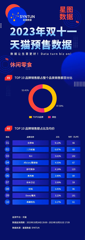 近日,据星图数据的统计,今年天猫双11预售榜中,休闲零食TOP10品牌销售额排行中,奶酪零食占据两席,Kiri奶酪闯进前三,超过了此前无法撼动的妙可蓝多,而妙可蓝多则排行第五。