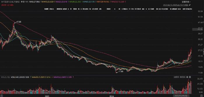 2025年,妙可蓝多以9.90元/股(公告前市价19.76元的50%,4月15日收盘价28.49元)实施员工持股计划,覆盖209人,资金上限7920万元。但考核门槛较高,2025年营收需达56亿元、净利润2.1亿元,远超2024年水平。
