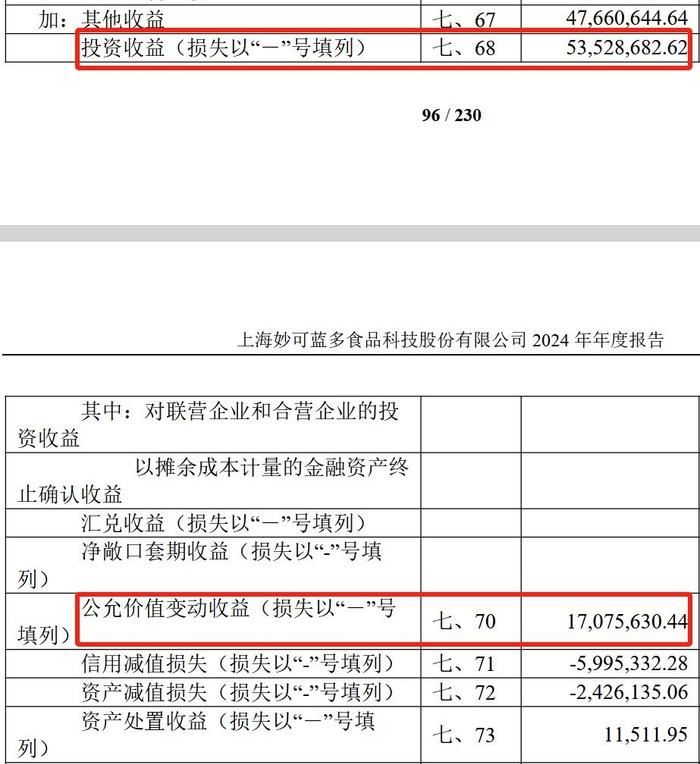 2024年,妙可蓝多营业收入48.44亿元,同比下滑8.99%;归母净利润1.14亿元,同比增长89.16%;扣非净利润激增554.27%至4692万元。这份“减收增利”财报高度依赖非经常性损益:公允价值变动收益占净利润15%,投资收益占比高达47%。扣非净利润仅4692万元,与归母净利润相差6670万元,表明公司核心业务盈利能力不足。