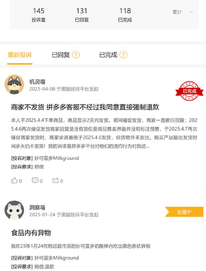 2024年,妙可蓝多因“反式脂肪酸”问题陷入舆论风波,相关话题阅读量突破千万,引发了消费者对儿童健康的广泛关注。尽管公司澄清产品符合国家标准,但相关疑虑仍未完全消除。黑猫投诉[下载黑猫投诉客户端]平台上,以“妙可蓝多”为关键词的过百条投诉中,不少关于产品异物、变质的投诉指向公司品控短板。