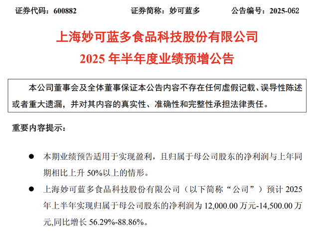 根据7月11日披露的业绩预告,今年上半年妙可蓝多预计实现净利润1.2亿元至1.45亿元,同比增长56.29%至88.86%。
