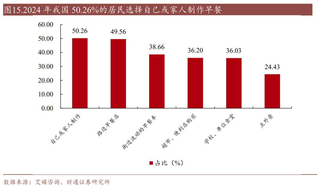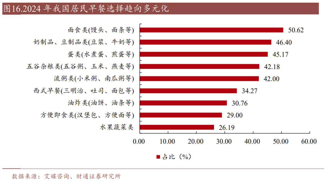早餐市场亟待进一步开发,多元化需求助力奶酪“上餐桌”。英敏特统计数据表明,2019年我国早餐市场规模已达1.8万亿元,2020-2025年以7.7%的复合增速持续增长,预计2025年可达2.6万亿元。艾媒咨询调研显示:2024年我国92.97%的消费者有吃早餐的习惯,且50.26%的消费者倾向于自己或家人制作早餐;另有7.03%的消费者因各种原因选择不吃早餐。因此,随着消费者健康意识的增强,早餐市场消费群体亟待进一步拓展。同时,我国居民早餐食品选择趋向多元化、健康化:面食类食品以50.62%的比例成为早餐的首选;奶制品、豆制品类紧随其后,占比46.4%;西式早餐(如三明治、吐司等)占比达34.27%,表明在西式餐饮习惯的影响与健康饮食生活的需求下,早餐场景对奶酪的需求有望增加。