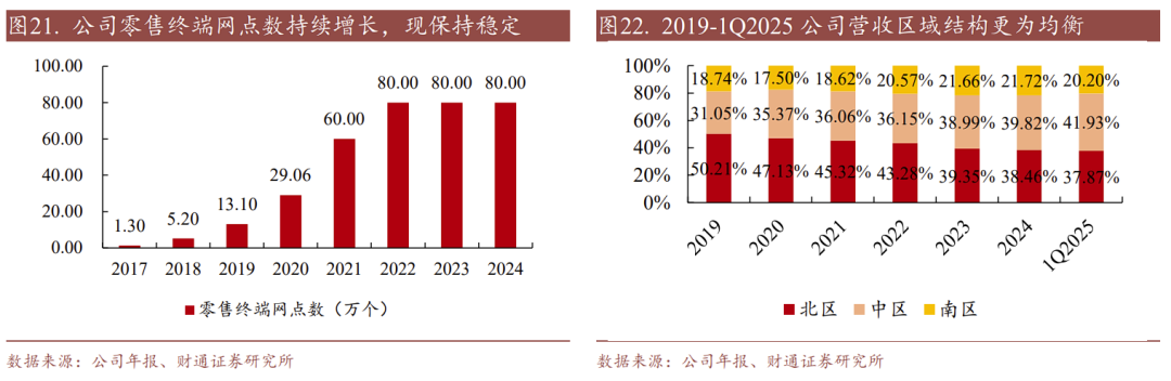 渠道精耕,多维销售网络覆盖全国。对于零售线下渠道,公司自2021年起坚持“低温做精、常温做广”,不断优化全国经销商布局、完善经销商服务体系;持续精耕现代渠道,大力开发烘焙、零食量贩、会员店等势能渠道,现已构建多维协作、纵深发展的全国销售网络。线上渠道方面,公司持续深耕京东、天猫、拼多多等传统电商平台,并于2024年与京东战略签约;大力发展抖音、快手等兴趣电商平台,同时积极拓展美团、饿了么、朴朴等即时零售业态。截至2024年年末,公司终端网点数量快速增长,目前稳定在80万左右;且中区、南区收入占比提升,营收区域结构更为均衡。