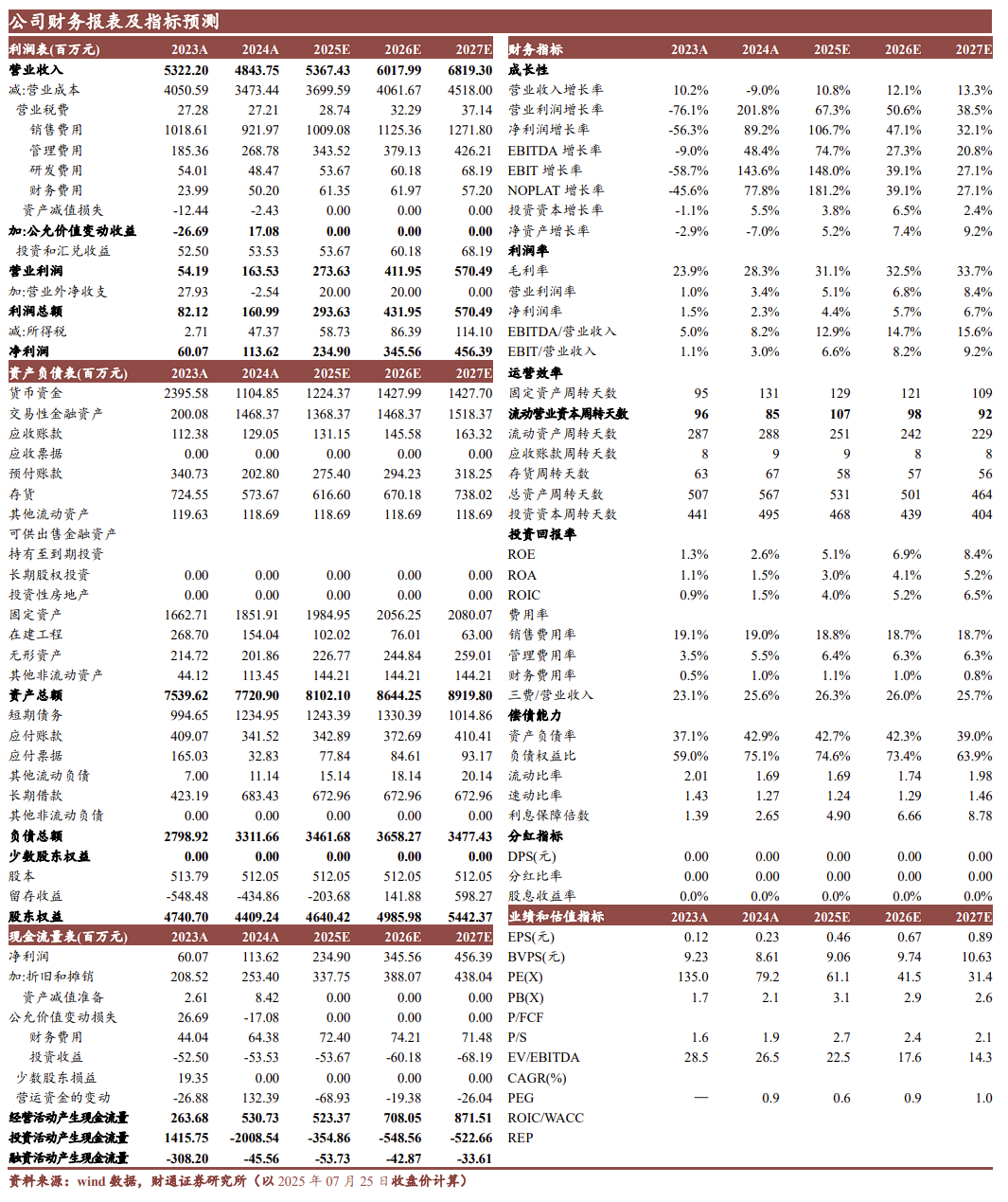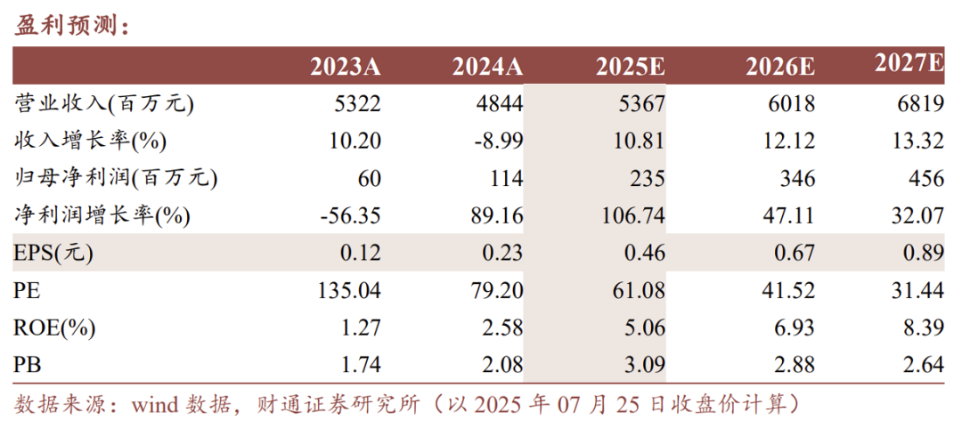 我们看好公司收入/利润双端进入改善通道,向上空间打开。我们预计2025~2027年公司营收为53.7/60.2/68.2亿元,同比增长10.8%/12.1%/13.3%;归母净利润为2.4/3.5/4.6亿元,同比增长107%/47%/32%,对应PE为61/42/31倍。首次覆盖,给予“增持”评级。