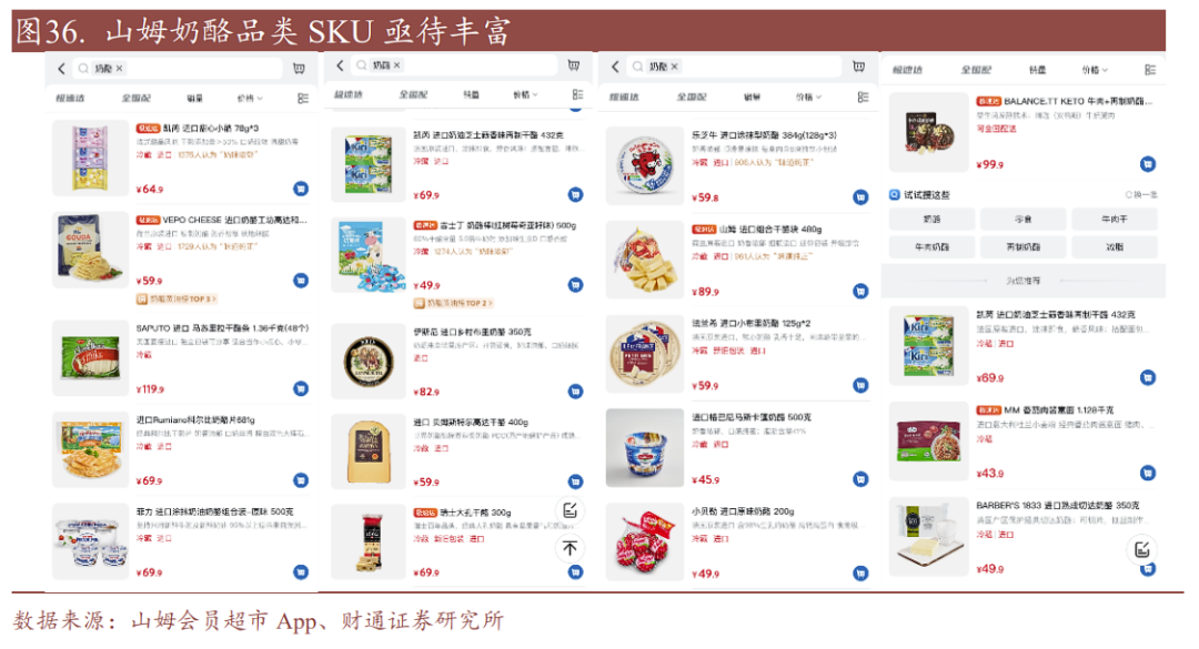 山姆奶酪零食SKU亟待丰富,公司产品具备爆品潜质。公司已于山姆上架与Balance.TT Keto的联名款产品“牛肉+再制奶酪”,后续仍布局自有品牌定制产品上架。目前,山姆奶酪品类SKU主要为进口原制干酪,包括奶酪博士(奶酪鳕鱼肠)、Kiri(甜心小酪)等,品类亟待丰富。公司与山姆的定制合作将进一步补足其奶酪品类,同时休闲零食的产品定位具备爆品潜质。