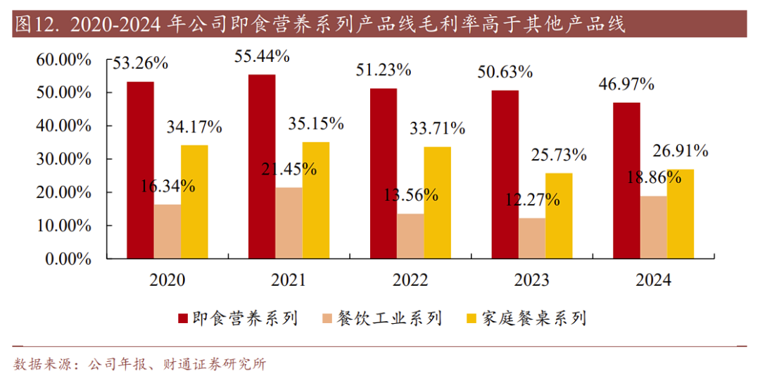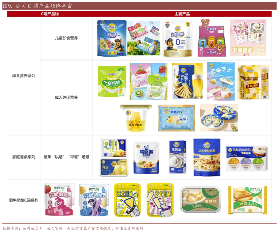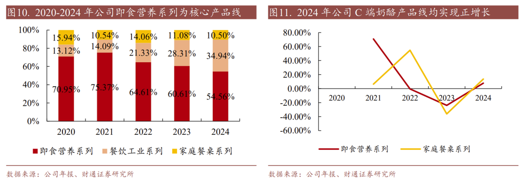 聚焦奶酪,不断丰富产品矩阵。公司坚定推行“聚焦奶酪”战略,以消费者为导向持续完善奶酪产品矩阵,现已构建包括即食营养系列(可细分为儿童营养系列、成人休闲营养系列)、家庭餐桌系列在内的C端产品线。2024年,公司完成蒙牛奶酪业务整合,进一步完善产品矩阵,C端产品系列均实现正增长;其中,即食营养系列收入贡献达54.56%,毛利率达46.97%,表现相对优于家庭餐桌系列。