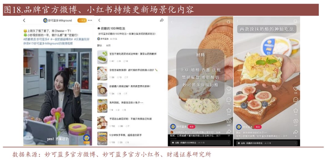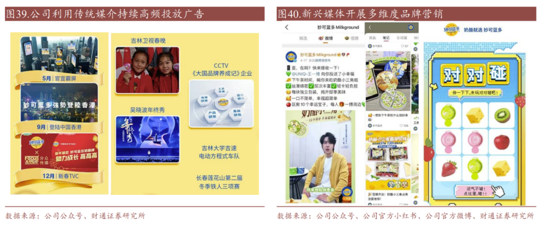 新老媒体高频投放,开拓社交媒体创新模式积极触达消费者,巩固品牌影响力。公司早期采取“高举高打”营销策略,凭借快速、精准、高频的打法让“奶酪就选妙可蓝多”的品牌价值诉求深入人心。现公司仍追求“长期聚焦”的媒介投放策略。1)传统媒介方面,公司持续与分众、央视、卫视等核心大屏媒体合作,以高强度投放占领消费者心智。如2024年全年分众霸屏投放,并赞助吉林卫视春晚、登上CCTV《大国品牌养成记》等。2)新兴媒体方面,公司利用小红书、抖音、微博等社交媒体平台发布多维场景化内容,并与网络达人合作开展品牌宣传、与消费者积极互动,巩固品牌认知。