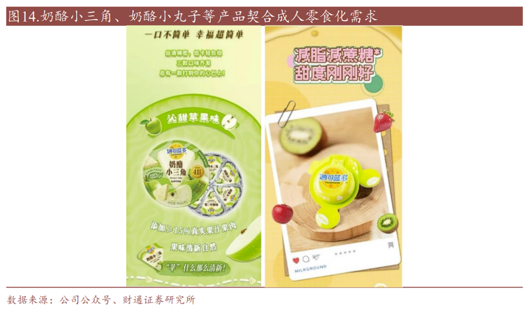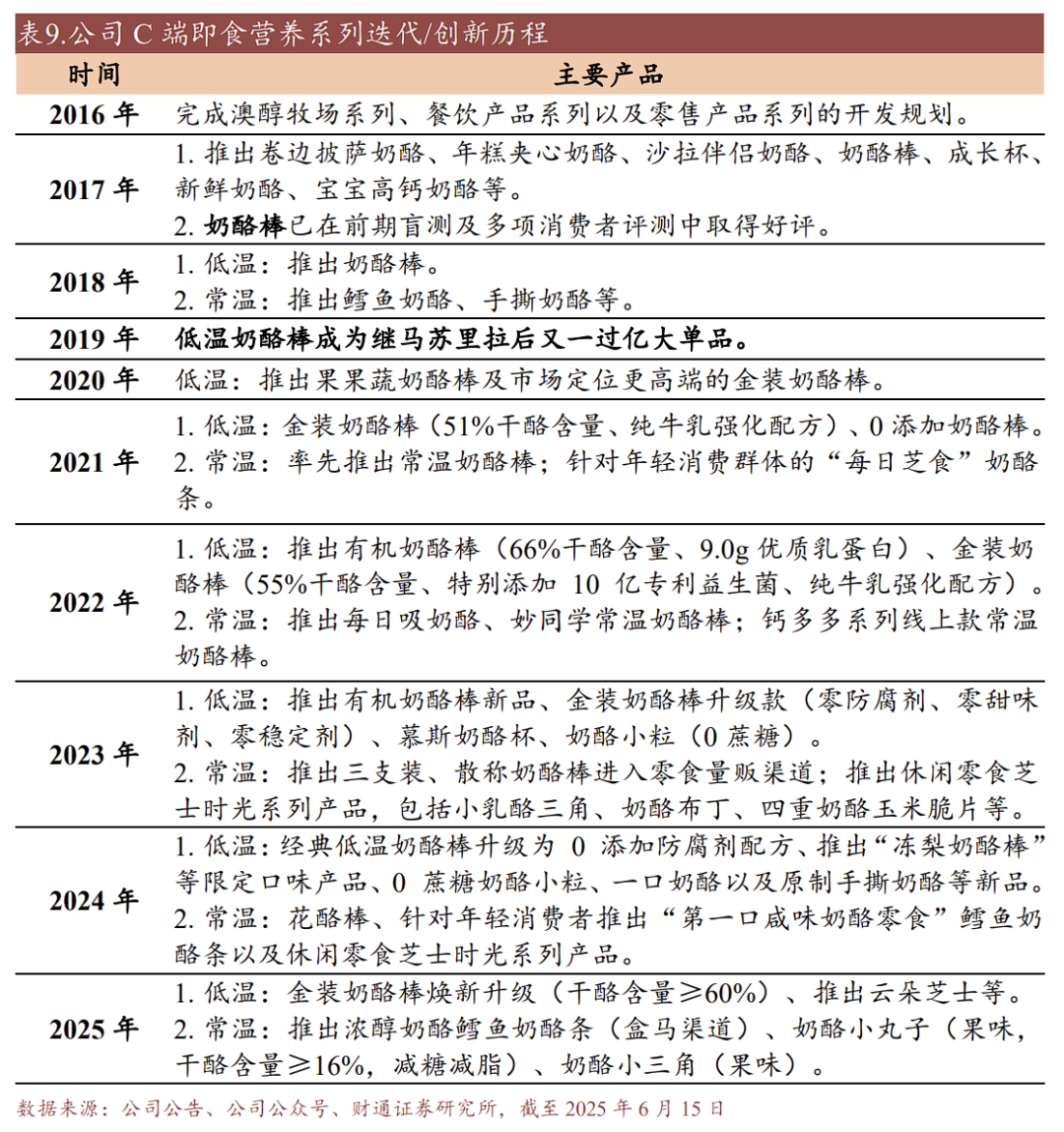 公司依托业内领先的研发能力,实现奶酪产品的持续迭代升级。自2018年低温奶酪棒上市以来,公司针对奶酪棒的口味、营养、干酪含量等各维度不断迭代升级,陆续推出了零添加金装奶酪棒、高钙奶酪棒、奇炫奶酪棒等升级品类,并于2021年推出常温奶酪棒,拓宽了奶酪棒产品的渠道和消费场景。公司在巩固核心大单品优势的同时不断进行产品创新,进一步丰富奶酪产品形态,通过面向成人的休闲零食化产品谋求场景、人群的双破圈。这一趋势在2024~2025年期间得到加速,公司陆续推出鳕鱼奶酪条、奶酪小粒、奶酪小三角、云朵奶酪等面向成人消费群体的奶酪零食产品,开拓好友聚会、工作休闲、运动分享等消费场景,进一步推动“场景破圈”。
