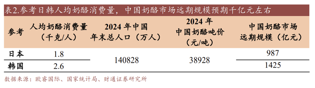 2)远期测算:我国人均奶酪消费量达到日本/韩国的水平(1.8kg/2.6kg)。2024年我国年末总人口为140828万人,奶酪吨价为38928元/吨。则当人均奶酪消费量达到1.8kg时,中国奶酪市场远期规模约为:人均奶酪消费量×年末总人口×奶酪吨价= 987亿元。同理,当我国人均奶酪消费量达到2.6kg时,中国奶酪市场远期规模约为1425亿元。