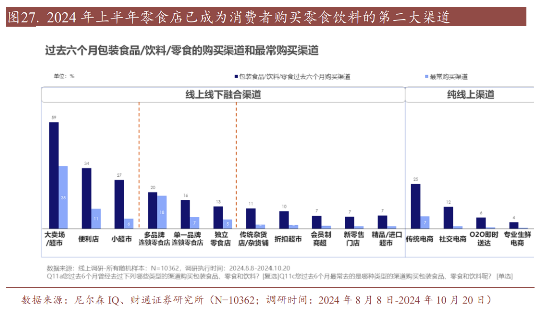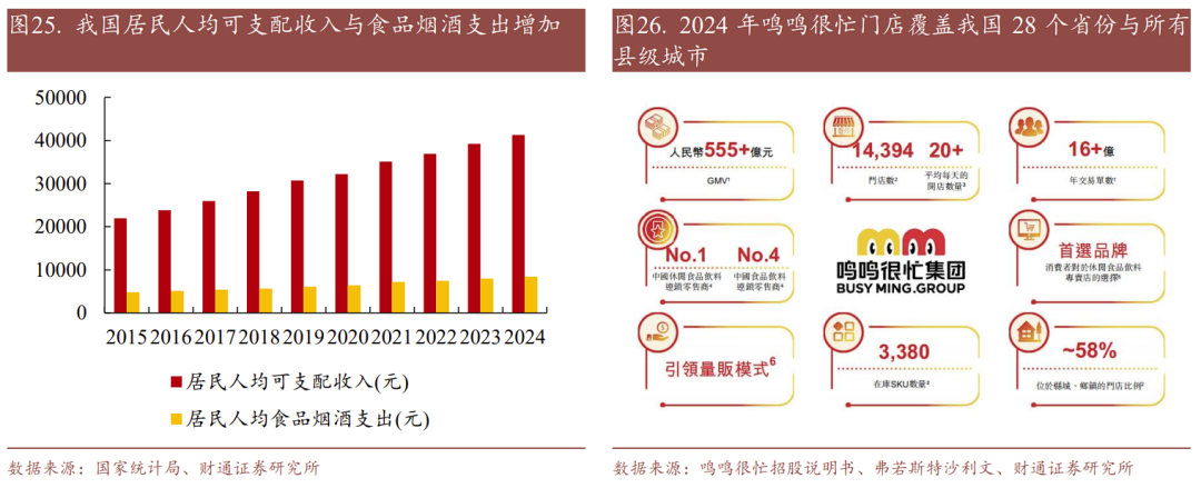 高性价比购物体验提升渠道渗透率,助力拓展消费群体。首先,随着人均可支配收入的提升,我国居民在食品烟酒方面的支出增加,更多消费者有能力实现“零食自由”;其次,零食量贩门店分布广泛,致力于打造多品牌、多品类、多规格产品的一站式购物体验,以“高性价比”为核心满足各类消费群体的需求,在我国零食饮料零售市场中的渗透率快速提升。尼尔森IQ调研数据显示,2024年上半年消费者购买零食/包装食品/饮料的各个渠道中,零食店(含销售多品牌产品的连锁店、单一品牌连锁店及独立门店)已成为仅次于大卖场/超市的第二大渠道。
