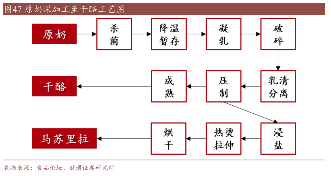 长期以来我国乳制品产业以液态奶为核心,经历数十年发展已经进入成熟阶段,当前正处于从液态奶到高附加值深加工的拐点。原奶通过凝乳、乳清分离等深加工工艺即可制成干酪或马苏里拉等固态乳制品。
