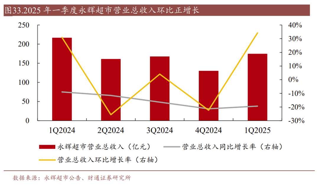 商超调改成效显著。自2024年起,胖东来“帮扶”永辉超市、步步高多家门店进行调改;华润万家等知名传统超市纷纷加入调改大军。调改将消费者需求及购物体验置于首位,围绕商品结构、经营模式、购物体验等维度开展系列化改革,并已取得显著成效:截至2025年一季度末,永辉超市全国47家调改门店中已有41家实现稳定盈利,单店日均销售额突破50万元,较调改前平均提升3倍以上;武汉、福州等地调改店客流暴增300%,销售额激增10倍;公司营业总收入环比恢复正增长。步步高超市调改一周年之际,16家调改店日均客流较调改前增长5倍,日均销售激增6倍,整体结束长周期亏损区间。