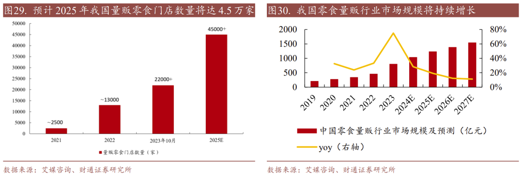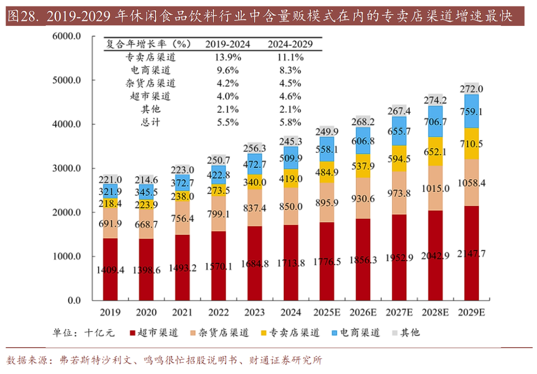 据弗若斯特沙利文测算,2019-2024年休闲食品饮料零售行业的各零售渠道中,包含量贩模式在内的专卖店渠道增速最快,复合年增长率高达13.9%;未来5年也将以11.1%的复合年增长率位居各渠道增速之首。随着全国门店数量的增长,零食量贩市场规模也将持续增长,助力拓展消费群体。