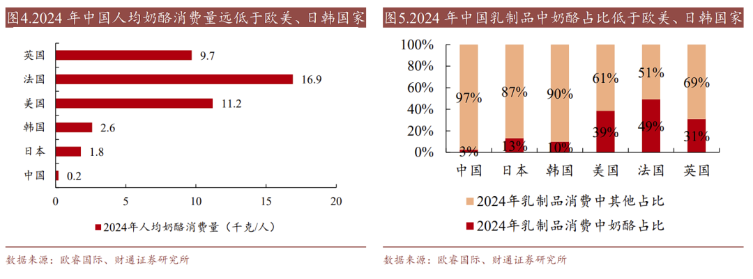 对标海外,我国奶酪行业市场规模仍有广阔的增长空间。欧睿国际数据显示:2024年我国人均奶酪消费量仅为0.2kg,而同期日本人均奶酪消费量为1.8kg,韩国为2.6kg;欧美主要国家人均奶酪消费量普遍较高:英国/美国人均奶酪消费量分别为9.7/11.2kg,法国则高达16.9kg。根据消费额测算,2024年我国乳制品消费中奶酪占比仅3%,饮食习惯相近的日韩分别为13%/10%;同期欧美主要国家乳制品消费中奶酪占比远高于我国,在30-50%之间。