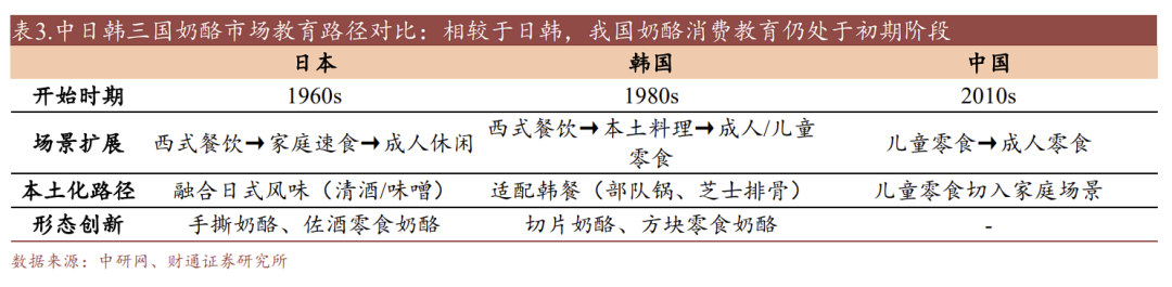 韩国:1988年汉城奥运会及1993年大田世博会加速了西式快餐的渗透,餐饮渠道驱动奶酪消费快速增长,并推动完成全国性的品类消费教育。1984年首尔乳业推出切达干酪切片,1989年每日乳业改良口味适配韩餐,1992年首尔乳业进一步推出儿童切片奶酪。2000年后韩国奶酪开始零食化,奶酪小块、涂抹奶酪等产品形态逐渐出现。