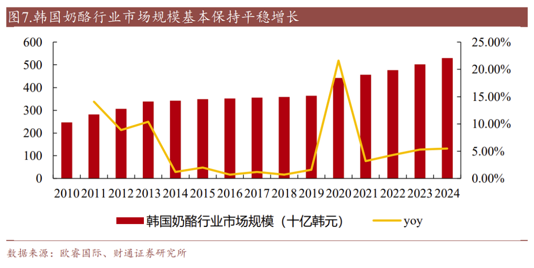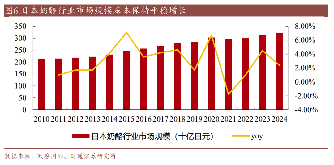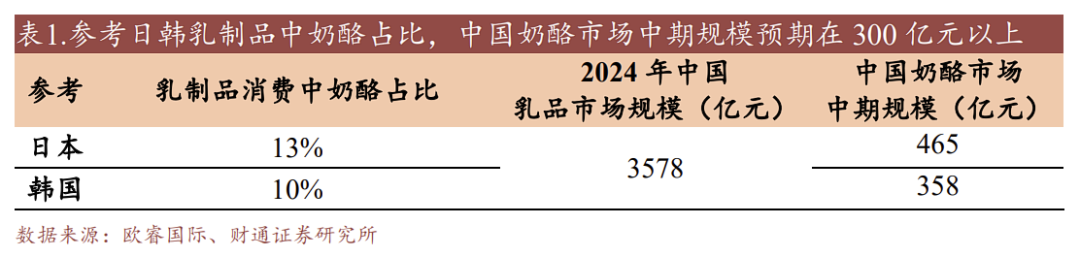 2024年起奶酪行业明显出清,行业竞争格局呈改善迹象,龙头集中度遇向上拐点,已由过度依赖儿童奶酪棒阶段进入品类多元化时代,行业壁垒明显提高。根据欧睿国际数据,2024年奶酪行业CR5为63.7%,同比提升3pct。对标欧美日韩等海外市场,随着我国多元化、健康化饮食需求的增加,奶酪行业市场规模仍有广阔增长空间,我们预计行业中期有望达300-400亿元规模。