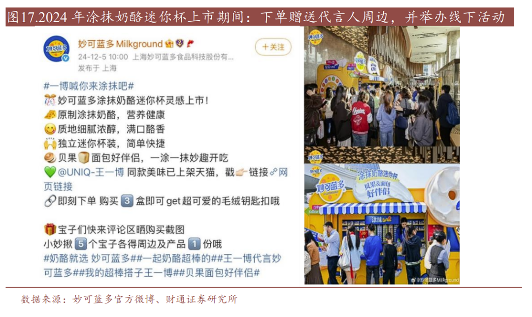 公司持续探索早餐与烘焙场景,“场景破圈”营销挖掘消费潜力。基于前文所述,公司持续探索早餐、烘焙场景,不断完善产品矩阵。营销推广方面,利用品牌代言人影响力、周边等助力“场景破圈”。以公司2024年下半年推出的新品“涂抹奶酪迷你杯”为例:以下单代言人同款产品赠送周边的方式增加热度,顺势举办上海、深圳两场线下活动“涂抹BAR”;微博、小红书等平台持续更新场景化内容,以食谱、短视频的形式拓展办公室等消费场景,挖掘潜在市场机遇。未来公司仍将紧扣早餐、烘焙场景,通过产品创新迭代响应消费者多元化、健康化的消费需求,实现家庭餐桌美食业务的突破。