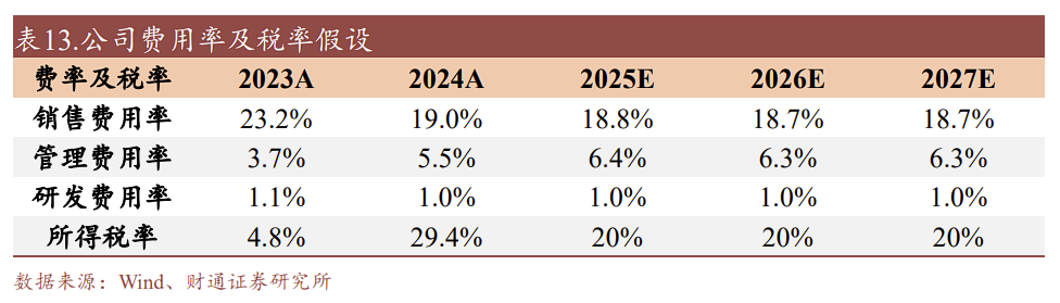 其他费用及税率:管理费用方面,考虑公司2025~2027年存在激励费用代摊销,销售费用率较此前会有所提升,但伴随降本增效,费率或稳中有降;税率方面,前期实际税率波动较大或主因利润不稳定,伴随公司收入增长回归正轨,利润稳定释放,税率或可维持相对稳定。