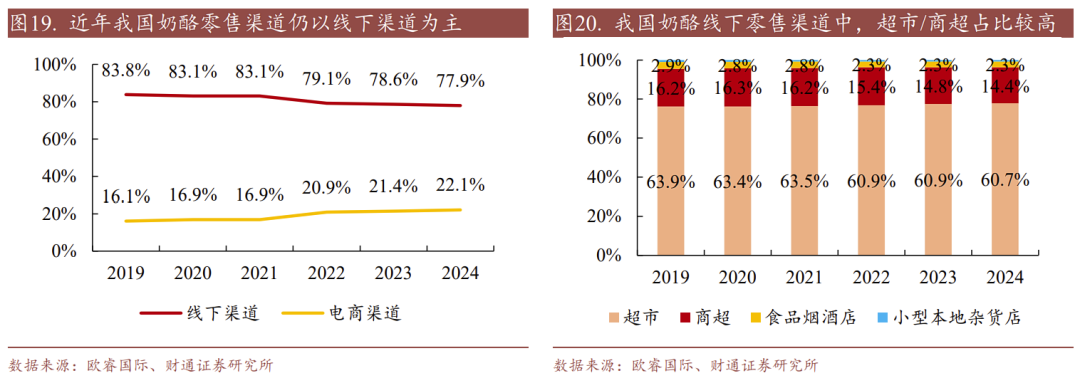 近年来我国奶酪零售渠道仍以线下渠道为主,电商渠道占比有所上升。根据欧睿数据,2019-2024年我国奶酪零售线下渠道贡献率有所下降,但占比仍接近80%;电商渠道占比由16.1%逐步上升至22.1%。进一步拆分线下渠道结构,可发现超市、大型商超为奶酪销售额的主要来源。