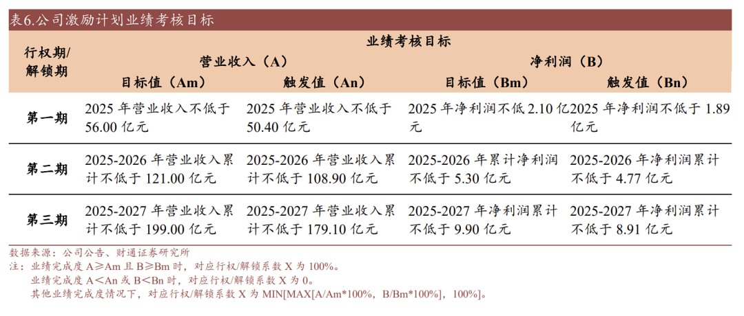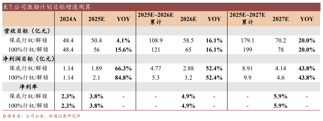 激励目标颇具野心,信心十足。公司两份激励计划业绩考核目标保持一致。经测算,公司保底行权或解锁的业绩目标为:2025~2027年营收增速4.1%/16.1%/20%,净利润增速为66.3%/52.4%/43.8%;100%行权或解锁的业绩目标为:2025~2027年营收增速15.6%/16.1%/20%,净利润增速为84.8%/52.4%/43.8%。我们认为公司对于未来2~3年增长充满信心,目标于2027年营收规模达到70~80亿元体量,尤其对于利润释放给予了更高的期望,目标2027年净利率达到近6%水平。