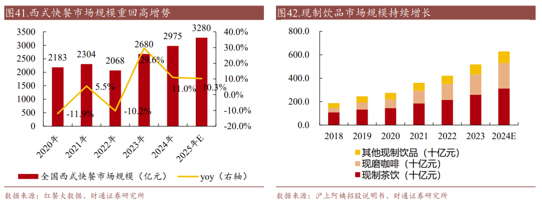 西快及现制饮品快速增长,奶酪B端应用乘上东风。近年来西式快餐及现制饮品渗透率提升,市场规模持续增长,根据红餐大数据,2024年中国西式快餐市场规模达到2975亿元,同比增长11%;根据灼识咨询,2023年现制饮品市场规模5175亿元,同比增长23%。奶酪在西快、烘焙、茶饮、咖啡等餐饮场景的“准刚需”属性日益明显,应用相对广阔,包括新式茶饮中的芝士奶盖、奶酪基底,西快中的马苏里拉、奶酪片、黄油、佐料、甜品或酱汁等。
