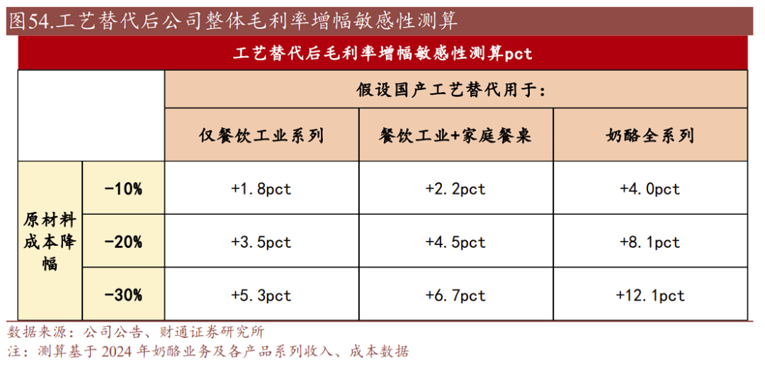 由于C端产品(尤其即食营养系列、家庭餐桌系列)对口味要求稳定,配方相对固定,初期不宜进行工艺替换,原材料或仍以进口干酪采购为主。我们预计公司主要对B端产品率先采用深加工工艺替代。近年来公司奶酪业务综合毛利率下行主因之一即是低毛利率的餐饮工业系列占比提升,因此对B端产品通过工艺替换后的增利效果或显著。以2024年为例,B端餐饮工业系列成本在总成本中占比31%,其中原材料成本占比达8成。基于2024年公司数据测算,假设工艺替代仅用于餐饮工业系列,原材料成本降幅若下降10%~30%,公司整体毛利率将增厚1.8~5.3pct。