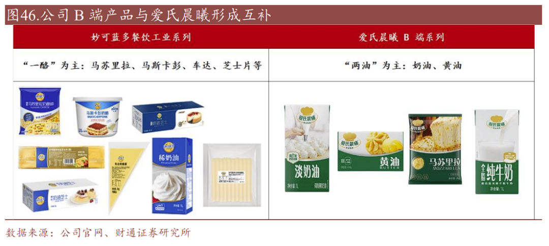 B端渠道转型升级,定位“专业乳品应用专家”,在蒙牛资源加持下,“两油一酪”互补协同,谋求突破。