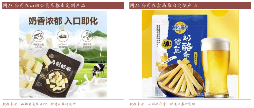 积极拥抱新兴渠道。近年折扣化业态、社区零售、即时零售等渠道模式成为消费新风尚,奶酪口味在势能渠道与平台深受欢迎。公司推进渠道精耕、积极拓展新兴渠道,如加速布局零食量贩渠道、推动自有品牌SKU进山姆、与盒马合作推出定制产品鳕鱼奶酪条等。我们认为零食量贩、山姆会员店、盒马等新兴渠道有望助力公司进一步扩大消费群体,成为双品牌协同发展的驱动力。