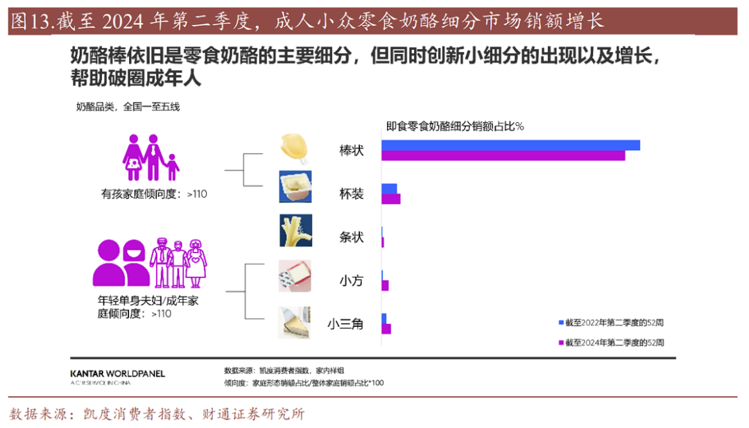 “奶酪+”策略顺应零食市场健康化趋势,持续破圈成人消费群体。从品类的角度而言:据凯度消费者指数,截至2024年第二季度的52周,奶酪棒依旧是零食奶酪的主要细分,但成人小众零食奶酪细分(小方形,小三角形)市场的销额增长表明细分赛道的需求日益凸显。从消费者偏好来看,弗若斯特沙利文报告显示当下消费者更愿意为健康、品质、情绪买单,目前零食创新呈健康化、情绪满足、功能性、灵活餐食等趋势。