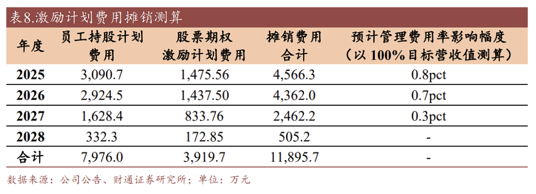 根据公司公告测算,本次激励费用对2025~2027年各年度管理费用率影响幅度有限,分别提升约0.8/0.7/0.3pct。