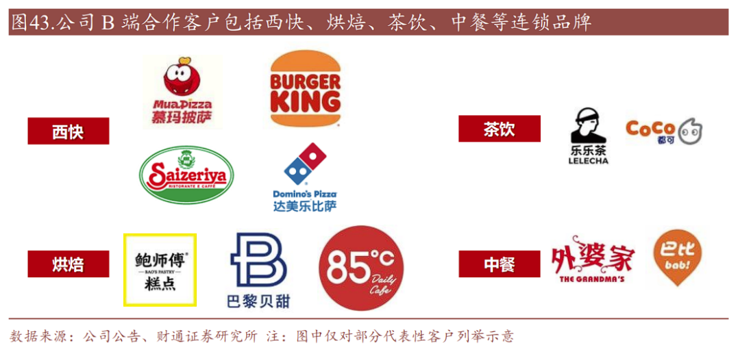 公司积极布局B端拓客,增长势头延续。公司持续推动由产品销售商向专业乳品服务商的转型升级,近年来在西餐、烘焙、茶饮咖啡、工业及中餐五大渠道中全面突破,与各赛道内头部企业形成良好合作。同时在战略层面,公司确定了“由B端带C端”的奶酪市场教育理念,优先从B端切入做大规模。一方面,B端快速起量可以率先发挥规模效应,拉高产能利用率的同时摊薄成本;另一方面,可以绕开C端的高成本营销,通过餐饮场景开展潜在消费者教育。