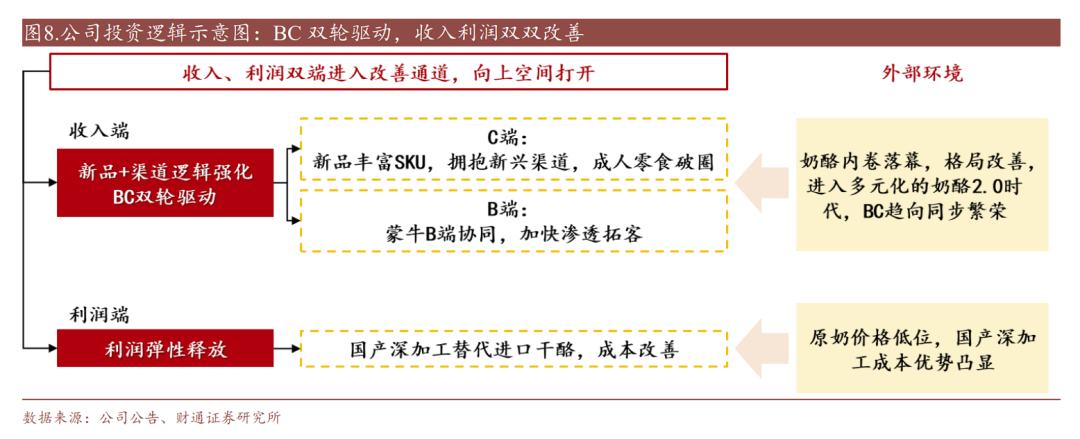我们认为,在新战略规划下,公司增长引擎有望顺利换挡,由以往对儿童奶酪棒这一单一品类较高依赖的路径,切换为新品/渠道多元引领、BC双轮驱动的多点共驱的增长模式。