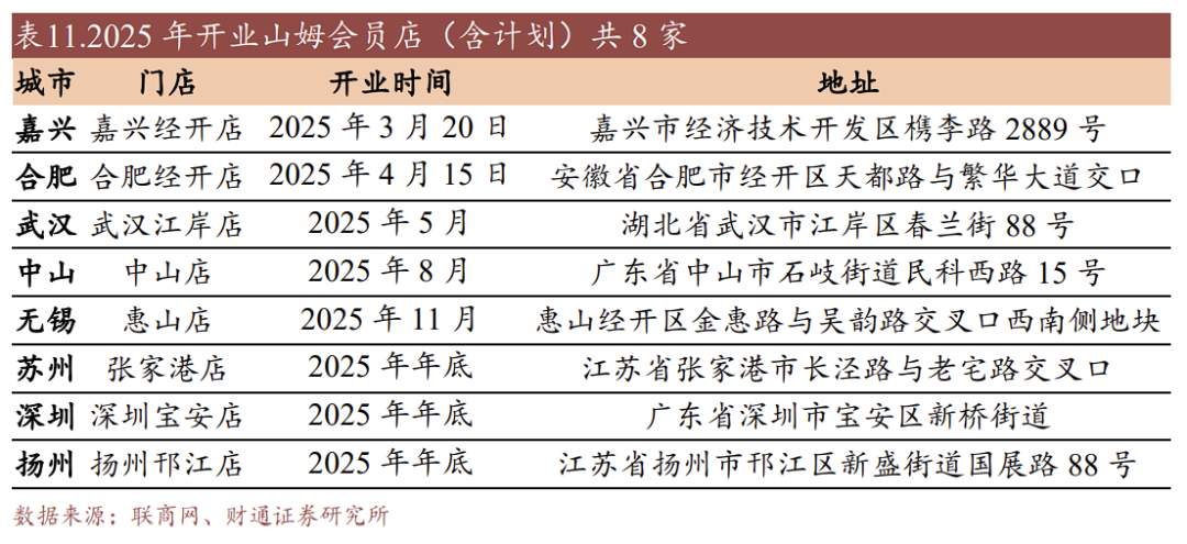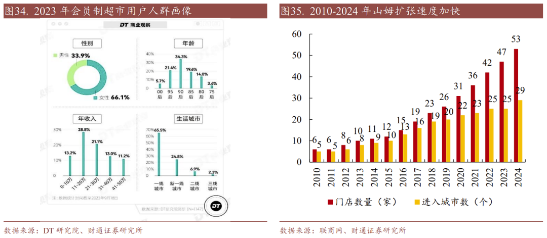 精准定位年轻、中产群体,“高质量下沉”式扩张契合公司“破圈”战略。据中国连锁经营协会统计,2023年山姆中国销售额已达843亿元;预计2024年销售额超1000亿。DT研究院调研数据显示,2023年我国会员制商超的主要购物者为25-40岁的年轻群体;年收入在11-50万的用户共占74.1%;且共90.3%的用户生活在一线/新一线城市。客单价方面,多数大卖场顾客单次消费普遍介于60-100元间,山姆会员单次消费可达800-1000元。同时,山姆设置260元/年或680元/年的会员费门槛,进一步筛选目标客群。区域布局方面,山姆正在加速扩张:从每年开业1-2家新店到如今平均每年6-7家新店,截至2025年年初,全国门店已达54家,预计年底突破60家。细看门店选址,可发现山姆正逐渐打破“只在一线城市开店”的状态:张家港/晋江/昆山店所在城市均为“百强县”头部成员。由北上广深等一线城市逐步深入“富裕县城”,山姆的“高质量下沉”战略在拓展市场份额的基础上实现了更精准的用户定位,契合公司的“破圈”战略。