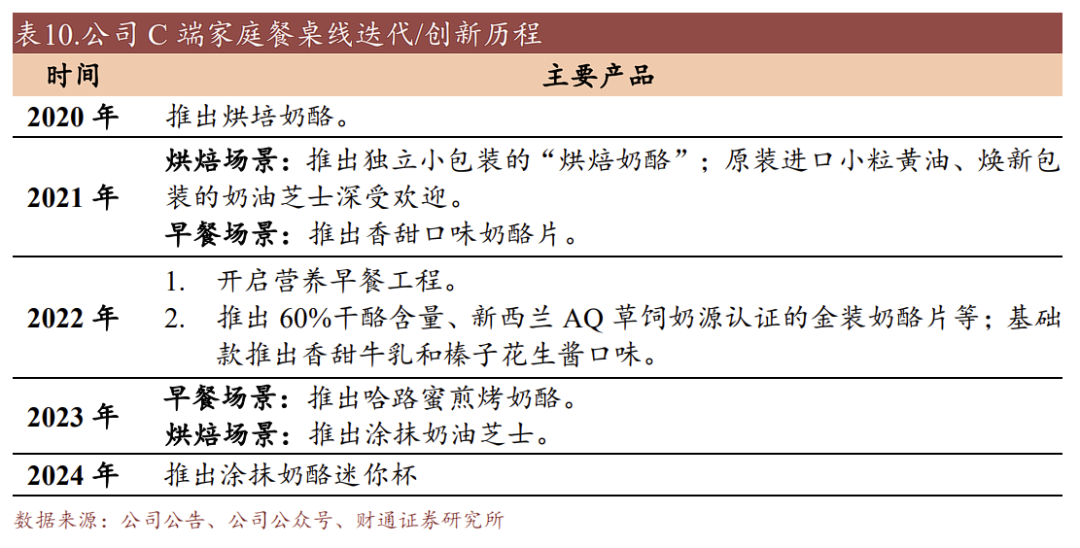 公司深耕由马苏里拉、黄油、奶油芝士组成的“烘焙三宝”系列,先后推出独立小包装烘焙奶酪、小粒黄油等产品,降低奶酪在家庭烘焙场景中的使用门槛;2022年公司开启营养早餐工程,在香甜口味的基础上推出香甜牛乳、榛子花生酱等新口味奶酪片,后于2023年、2024年分别推出哈路蜜煎烤奶酪与涂抹奶酪迷你杯,回应我国消费者搭配面包、贝果等早餐场景的丰富需求。