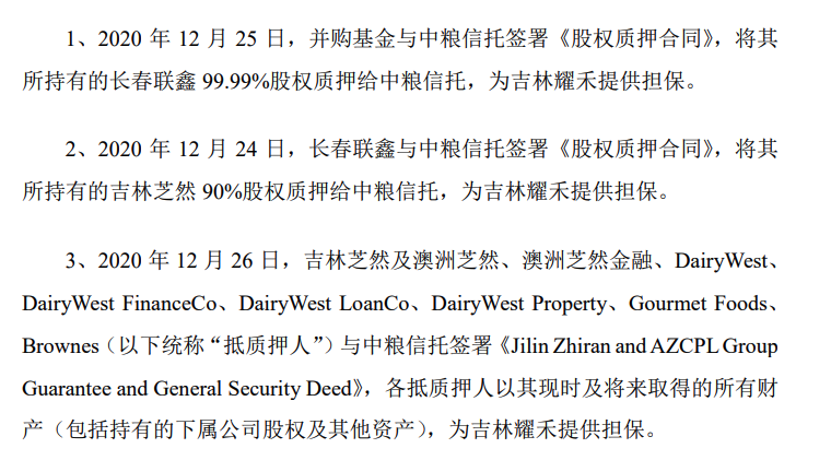而在此期间,即2020年12月24日,吉林耀禾与中粮信托有限责任公司(以下简称“中粮信托”)签署《信托贷款合同》,中粮信托将向吉林耀禾累计发放本金不超过7亿元的贷款。同时,为担保吉林耀禾的还款义务及其他各项义务的履行,上海祥民股权投资基金及其下属控制主体提供提供了连带责任保证及相关财产的抵押、质押担保,具体如下图。