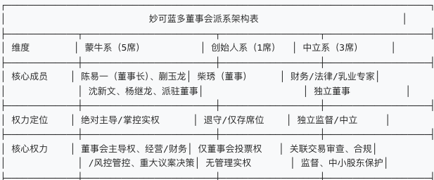 柴琇虽仍持股14.92%,是妙可蓝多第二大股东,但其在董事会层面早已失去主导权——蒯玉龙、陈易一、沈新文、杨继龙等蒙牛系成员相继担任公司关键职位且进入董事会。