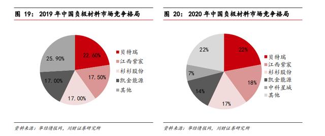 目前,负极材料市场呈现“三大五小”的格局,“三大”指的是贝特瑞、江西紫宸(璞泰来子公司)和杉杉股份。2020年,贝特瑞、江西紫宸、杉杉股份的市场份额分别为22%、18%、17%。