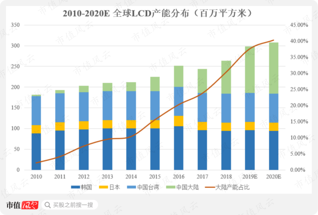 2016年至今,全球面板产业链逐步向中国转移,中国大陆市场的LCD面板产能及份额得以快速提升,规模已位居全球第一。