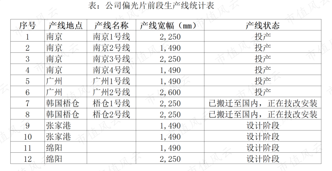 偏光片业务目前拥有8条前端生产线,产能约1.3亿平方米,其中5条为2米以上的超宽幅生产线,是全球超宽幅领域的市场领导者,也是业内首家使用超宽幅生产线的公司,其中2600毫米超宽幅生产线是全球最大的。