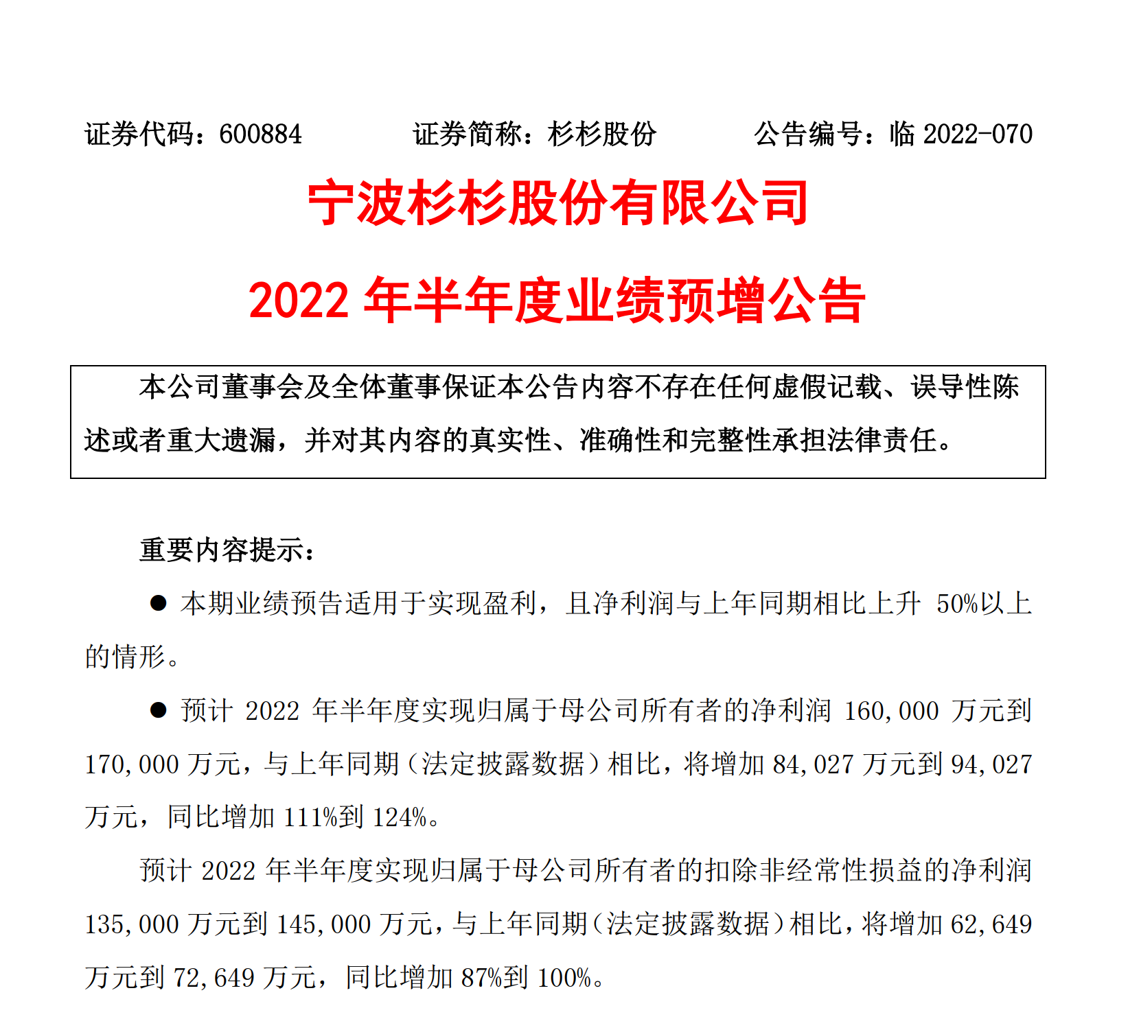 7月13日,杉杉股份(SH600884,股价29.45元,市值636亿元)发布了《2022年半年度业绩预增公告》,预计2022年半年度实现归属于母公司所有者的净利润16亿元至17亿元,同比增加111%到124%。