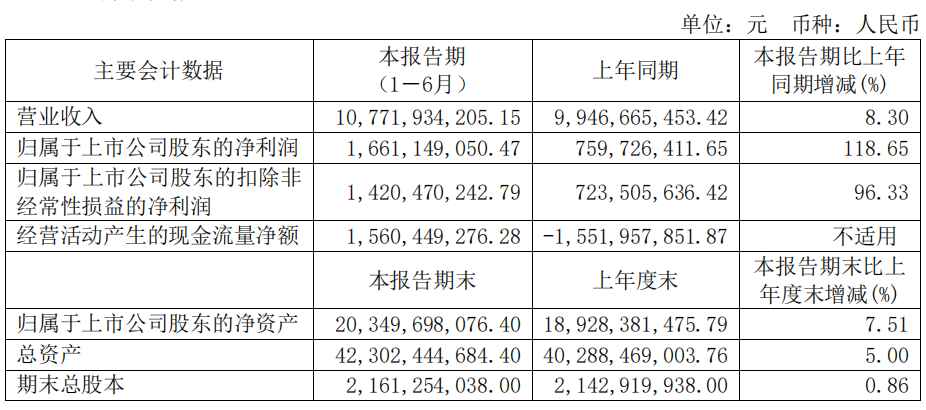 杉杉股份于8月11日发布2022年半年度报告,上半年实现营业收入约107.71亿元,同比增长8.3%;实现归属于上市公司股东的净利润约16.61亿元,同比增长118.65%;实现归属于上市公司股东的扣除非经常性损益的净利润约14.2亿元,同比增长96.33%。