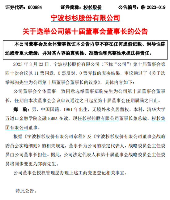 3月23日,杉杉股份第十届董事会第四十次会议以11票同意,0票反对,0票弃权的表决结果,审议通过了《关于选举郑驹先生为公司第十届董事会董事长的议案》。