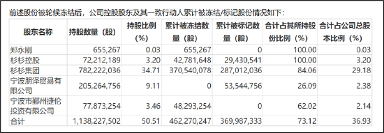 截至公告发布日,杉杉股份控股股东及其一致行动人累计被冻结/标记股份情况如下:合计持股数量为1,138,227,502股,占公司总股本的50.51%;累计被冻结数量为462,270,247股,累计被标记数量为369,987,333股,合计占公司总股本的36.93%。